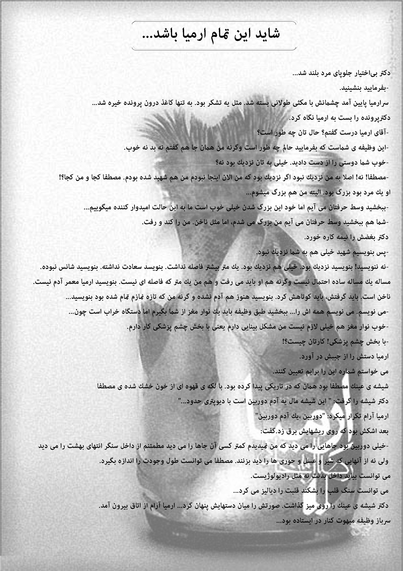 باز هم مکثِ همیشگی ارمیا.به این جای نماز که میرسید صورتش در هم می رفت.فکری به پیچیده گی و در هم ریخته گی موهایش به جای روی سر،توی سرش ریشه می دواند:«من چه ربطی به بنده گان صالح خدا دارم؟ شاید خدا خواسته مرا مسخره کند. من با...»